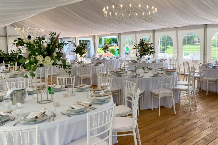 Felszereltsége: 12 db 180 cm átmérőjű körasztal (10-11 fő/asztal), fehér Chiavari székekkel, 6 db könyöklővel, 12 db bankett asztal, földig érő terítők minden asztal típushoz, a vendéglátáshoz szükséges teljes eszközfelszerelés, porcelán tányérok, minőségi üvegpoharak, textil hatású szalvéta, 2 db 20 ágú, nagyméretű egyedi csillár, 12 db háttérvilágító lámpa, vörösfenyő padozat és a sátorhoz tartozó férfi, női mosdó. A rendezvényhelyszín mennyezeti fehér selyem dekorral ellátott. Igény esetén oldalfalak és asztalok dekorálása lehetséges a megrendelő igénye szerint, melyhez ajánljuk együttműködő partnereinket vagy az önök által szabadon választott szolgáltatót. Kérjük Önöket, hogy a vendégház parkjában csak növényi eredetű sziromszórás történjen. A rendezvényhelyszín előre egyeztetett korább időpontban az esküvő szervezői (dekoratőrök) tudják már díszíteni. A rendezvényhelyszín díja: 600000,- Ft/alkalom.