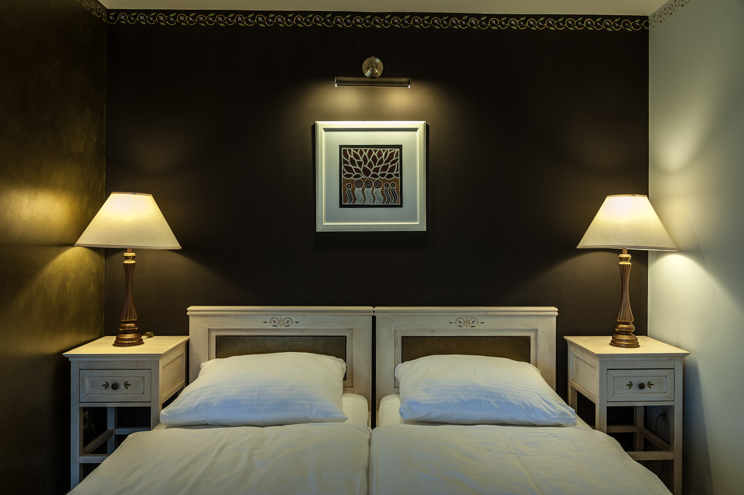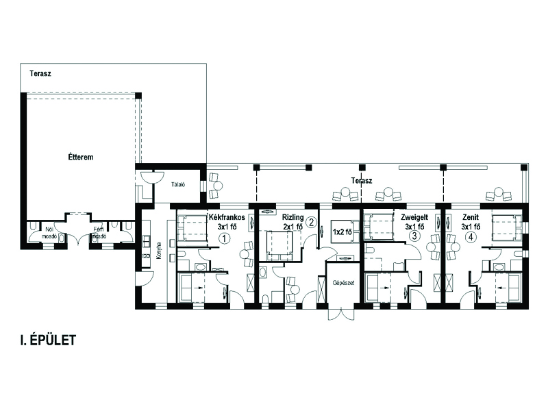 Ágyak (Franciaágy mérete 180 X 200 cm, mely kérésre 2 db 90 X 200 cm fekvőhellyé alakítható); ágynemű (nagypárna, kispárna, takaró), törölköző, fürdőlepedő, székek, asztalka, komód, szekrény, fogas, bőröndtartó.