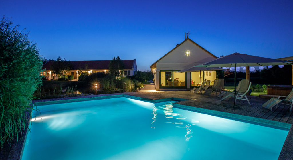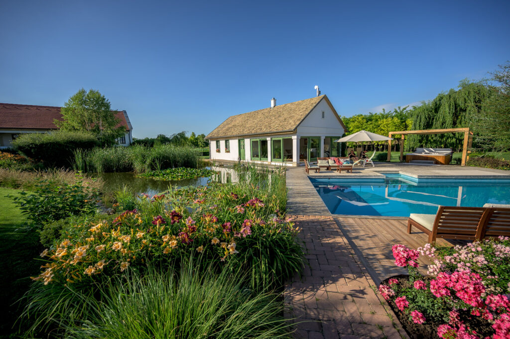 Szaunaházunk közvetlen kertkapcsolattal rendelkezik, így a wellness élményét kültéri medencénk hűsítő vize, a dísztó nyugodt látványa és a napozóterasz kellemes hangulata egészíti ki.